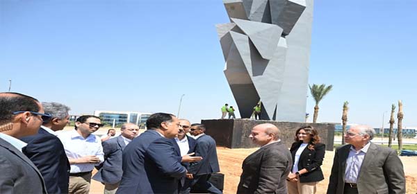 وبدأ الدكتور مصطفى مدبولي جولته، بالوقوف عند منطقة "التمثال الجديد" عند مدخل طريق القاهرة الإسكندرية المُؤدي للمتحف المصري الكبير بالقرب من بوابة الرسوم، حيث تمت الإشارة إلى أنه تم تنفيذ التمثال وتصميمه تحت إشراف الدكتور طارق صبحي، استشاري المشروع، ضمن جهود تطوير المنطقة المحيطة بالمتحف، وأنه يُعد "قطعة فنية" تُعبر عن البيئة المحيطة، حيث انه مُستوحى من الحضارة المصرية القديمة، وتم تصميمه ببراعة من خلال مراعاة الدمج بين الفن المصري القديم والفن الحديث المعاصر، إلى جانب التنويه إلى الانتهاء من أعمال صب الخرسانة، والانتهاء من تركيب التمثال على القاعدة، وجار الانتهاء من أعمال اللحامات وتركيب الرخام، كما تمت الإشارة إلى الانتهاء من أعمال زراعات النخيل بنسبة 100% ، وجار البدء في "أعمال الكهرباء"، حيث تم توريد كشافات النخيل بنسبة 100 %، حيث وجه رئيس الوزراء بسرعة الانتهاء من تنفيذ أعمال الإنارة وتوفير الإضاءة اللازمة للتمثال، وكذلك الانتهاء من أعمال تسوية وتمهيد المنطقة المتواجد بها التمثال.