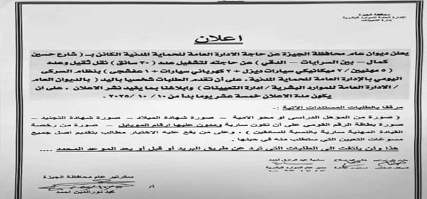 الكائنة بشارع حسين كمال – بين السرايات – الدقي، إلى تشغيل عدد (30) سائق نقل ثقيل، وعدد (5) من الفنيين (عدد 2 ميكانيكي سيارات ديزل + عدد 2 كهربائي سيارات + عدد 1 عفشجي)، بنظام السركي اليومي بالإدارة العامة للحماية المدنية.